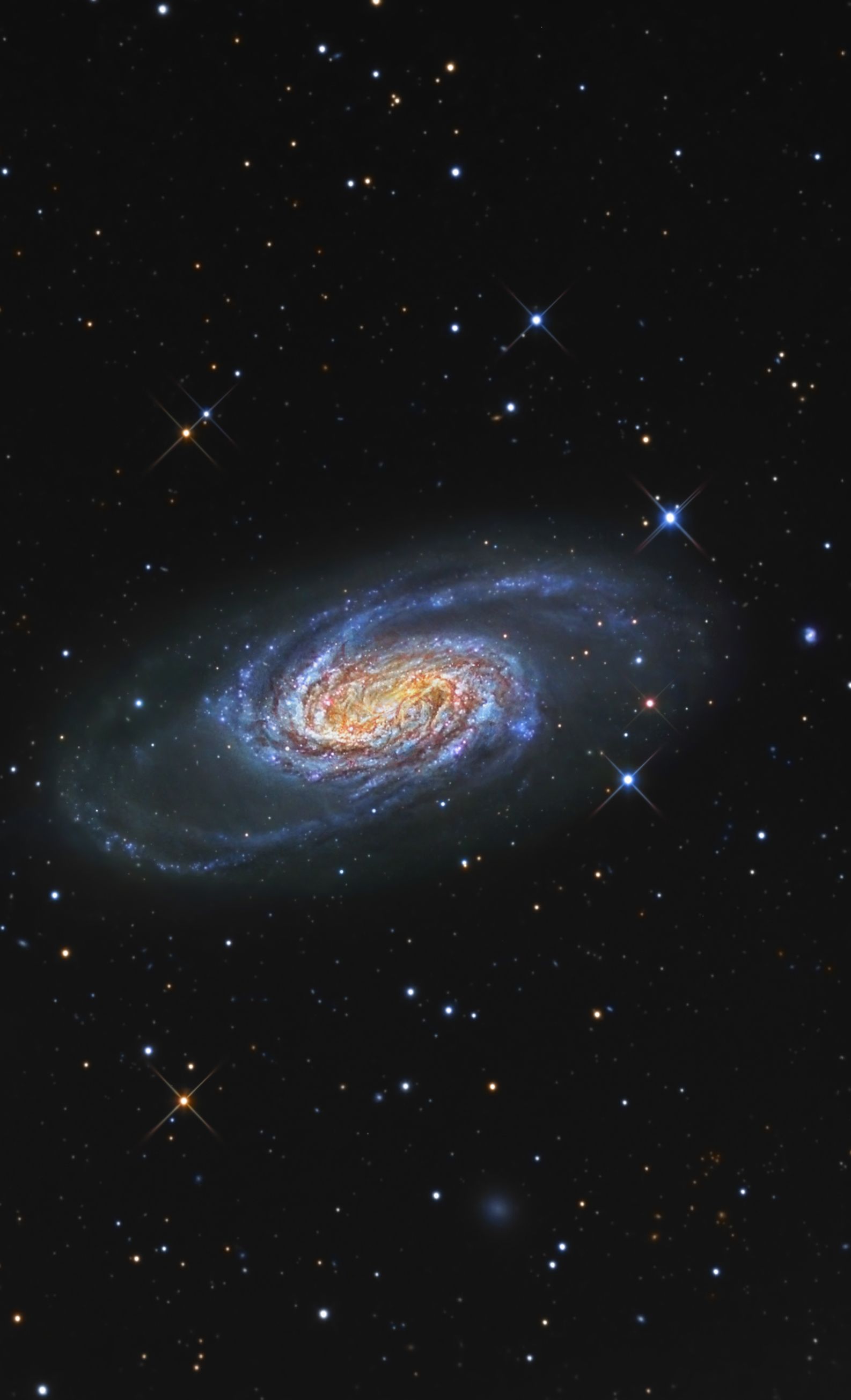 Astronomický snímek dne http://www.astro.cz/apod/ap070706.html | Spirální galaxie NGC 2903 je jen asi 20 miliónů světelných let daleko v souhvězdí Lva (Leo). Je překvapivé, že tato jedna z nejjasnějších galaxií viditelných na severní obloze chybí ve slavném katalogu nebeských pozoruhodností Charlese Messiera. Tento působivý ostrý barevný snímek ukazuje krásná modrá spirální ramena této galaxie. Na snímku z pozemského dalekohledu jsou také spletité podrobnosti centrálních oblastí NGC 2903, pozoruhodná směs starých a mladých hvězdokup s nesmírnými prachovými a plynnými mračny. NGC 2903 projevuje opravdu výjmečnou míru vznikání hvězd poblíž svého centra a je také jasná v rádiovém, infračerveném, ultrafialovém a rentgenovém pásmu. NGC 2903 je jenom o něco menší než naše Mléčná dráha, měří asi 80 000 světelných let. |