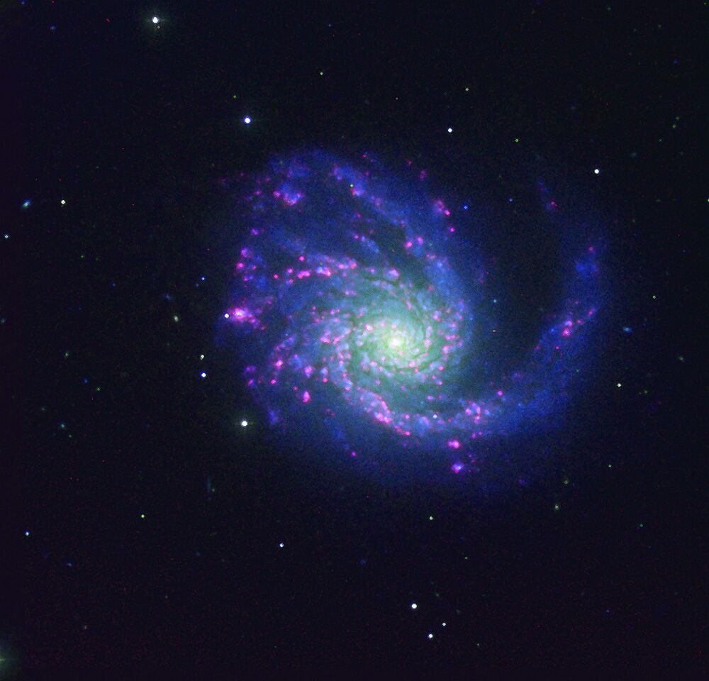 www.ing.iac.es http://www.ing.iac.es/PR/newsletter/news6/johan7.jpg | Přestože se NGC 4264, též M99, nachází v souhvězdí Vlasy Bereniky, je jednou z nejjasnějších spirálních galaxií Virga. Je typu Sc, otáčí se po směru hodinových ručiček a je neobvykle asymetrická; střed je posunut více směrem nahoru (viz. obrázek). Pohybuje se rychlostí 1200 km/s směrem od nás. |