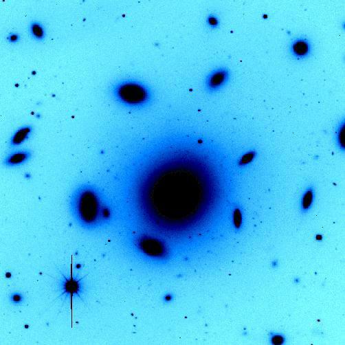 Encyclopedia of Astronomy and Astrophysics http://eaa.iop.org/ | The center of the Coma cluster of galaxies, dominated by the bright elliptical galaxy NGC 4874, which is surrounded by a swarm of fainter, featureless elliptical galaxies. (Image courtesy of the Isaac Newton Group of Telescopes, La Palma and the SMAC (Streaming Motions of Abell Clusters) team.) |