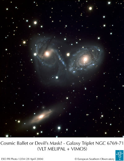 www.eso.org http://www.eso.org/outreach/press-rel/pr-2004/images/phot-12-04-preview.jpg | Kosmický balet nebo Ďáblova maska? Trojice galaxií NGC 6769 - 71. |